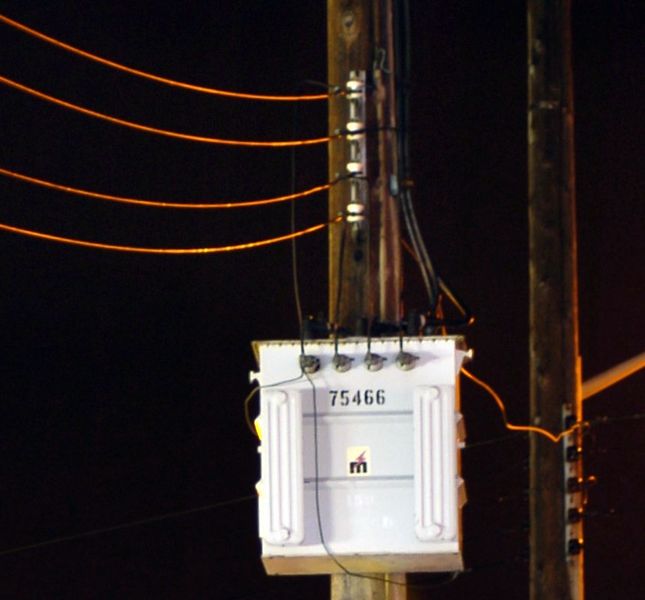 !Трехфазный понижающий трансформатор на столбе линии электропередач